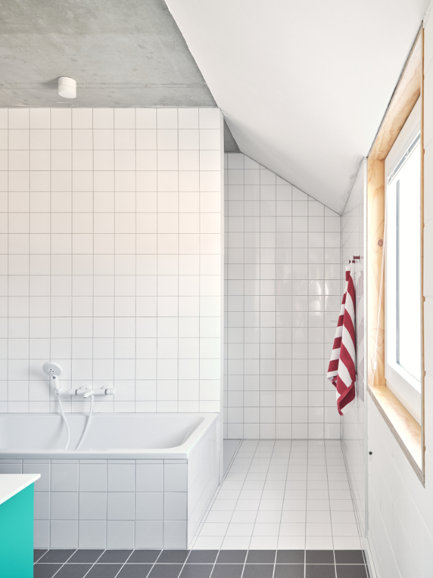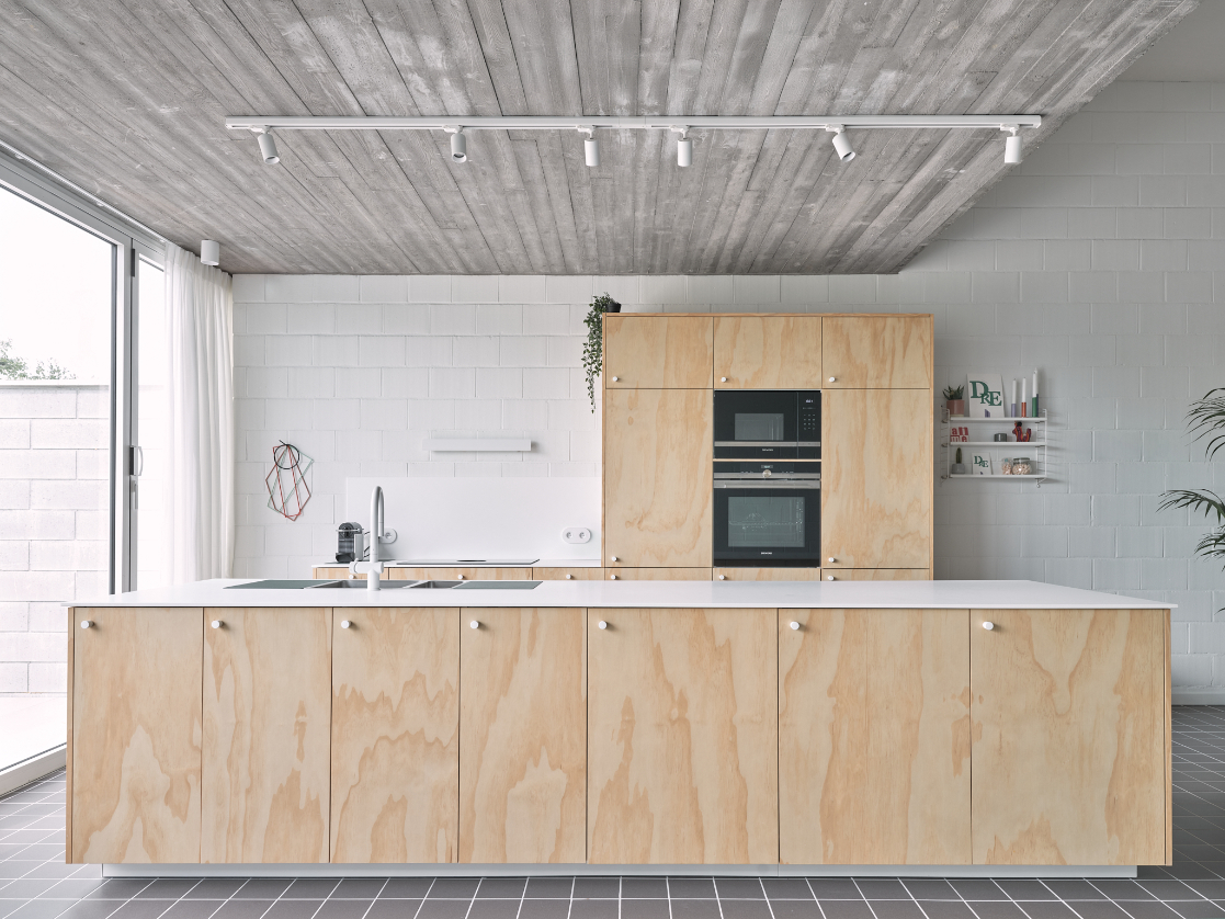In deze split level woning leven bewoners tussen de drie nieuwe afgesloten volumes. De garage op het gelijkvloers. Een master bedroom en een eerste kinderkamer aan de achtergevel. De badkamer en een tweede kinderkamer aan de voorgevel.