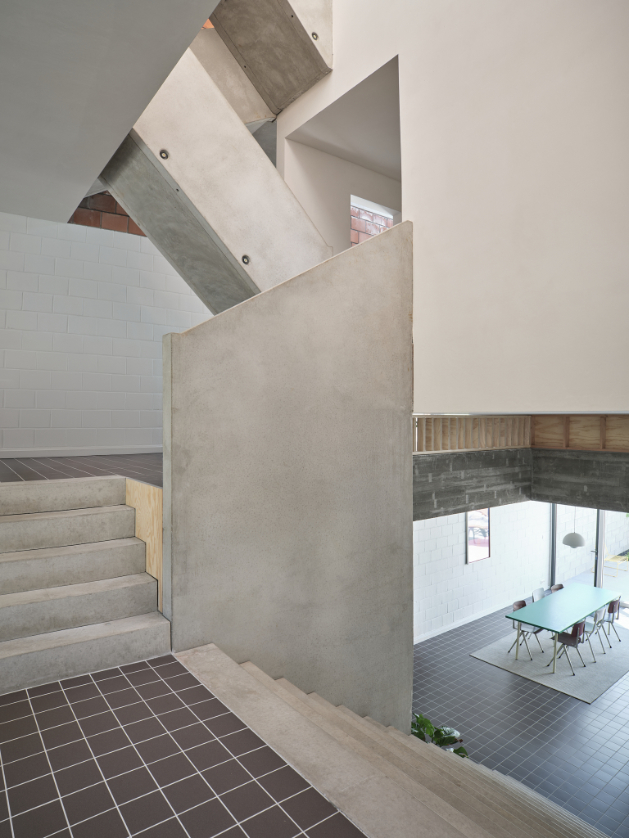 We integreren een betonnen trappenspel in de woning als sculptuur. Een monoliete betontrap als tussenruimte.Split levels verbinden de volumes en positioneren bewoners visueel tegenover elkaar. Een daklicht boven de trap stuwt zenitaal licht doorheen de woning.